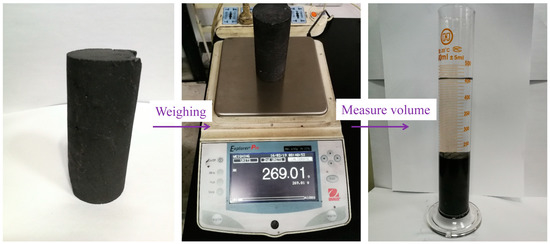 In addition to the CT scanning experiments, the density and permeability of reconstituted coal specimens were also measured. The measurement principle of coal specimen density is shown in Figure 5. First, a high–precision electronic balance was used to accurately measure the quantity of the specimen. Then, the coal specimen was wrapped in plastic film, and its volume was measured using a measuring cylinder. Furthermore, the permeability of the specimen was measured by adopting the steady–state method. During the specimen permeability measurement process, methane with a pressure of 1.5 MPa was utilized, and the confining pressure was increased from 4 to 24 MPa.