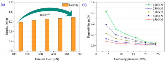 The density and permeability measurement results are shown in Figure 6. Figure 6a exhibits the density measurement results, indicating that the specimen density increases from 1.18 to 1.38 m3/t when the external force increases from 150 to 550 KN. In the Sijiazhuang coalmine, the density of the 15# coal seam is ~1.41 m3/t. Therefore, when the external force increases to 550 KN, the density of the reconstituted specimen is very close to that of the tectonic coal in the field. As seen from the permeability measurement results in Figure 6b, the specimen permeability is negatively correlated with confining pressure, which is consistent with the current perception. Moreover, the greater the external force, the lower the specimen permeability. Considering the confining pressure of 24 MPa as an example, the permeability of the specimen reconstituted under 150 KN external force is 0.04479 mD, while that of the specimen reconstituted under 550 KN decreases to 0.00651 mD. Under the current mining depth in the Sijiazhuang coalmine, the coal permeability ranges from 0.003 to 0.01 mD, and the average in situ stress is approximately 20 MPa. Figure 6b illustrates that the permeability reconstituted at 550 KN is ~0.00824 mD under a confining pressure of 20 MPa, which is very close to field permeability data. According to the density and permeability measurement results, it can also be concluded that the compaction degree of the reconstituted coal specimen improves with the external force. The greater the external force, the higher the compaction degree. Moreover, when the external force increases to 550 KN, the compaction degree of the reconstituted specimen is very close to that of the tectonic coal in the field.