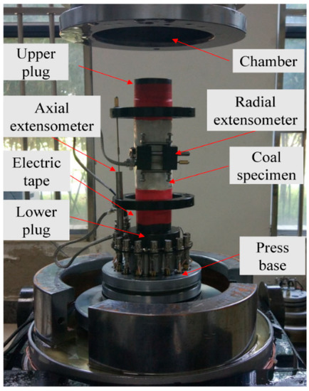 The above results indicate that the compaction degree of the reconstituted coal specimen is almost the same as that of the tectonic coal in the field under an external force of 550 KN. Therefore, in this study, the external force of 550 KN was adopted to reconstitute the tectonic coal specimen. Based on the reconstituted coal specimens and the intact coal specimens obtained through coring, the mechanical properties of tectonic coal and intact coal were measured and compared. In this study, the uniaxial and triaxial compressive stress paths were adopted. The mechanical and seepage experiment system introduced by Liu et al. [8] was used herein as the experimental equipment. Under the triaxial compressive stress path, the following confining stress (σ3) values were adopted: 5, 10, 15, and 20 MPa. During the experimental process, the confining stress was first loaded to the target value at a rate of 0.05 MPa/s. For the loading of the axial stress, the stress loading mode was adopted up to the yield point. Subsequently, the displacement loading mode was adopted until the end of the experiment. Under the stress loading mode, the loading rate of axial stress was 0.05 MPa/s. Under the displacement loading mode, the displacement loading rate was 5 mm/min. Moreover, a set of large range extensometers was used in this study considering the large deformation property of tectonic coal, as shown in Figure 7. The range of the axial extensometer is 0–25 mm and that of the radial extensometer is 0–12.5 mm.