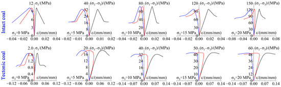 Figure 8 exhibits the total stress–strain curves of intact coal and tectonic coal. Both intact coal and tectonic coal exhibit an elastic–brittle property under the uniaxial compression stress. After reaching the peak point, the axial stress drops rapidly. However, the total stress–strain curves of intact coal and tectonic coal are obviously different under the triaxial compression stress path. Notably, in the pre–peak stage, the stress–strain curve of tectonic coal is much flatter than that of the intact coal, indicating that tectonic coal shows weak resistance to deformation. Moreover, the tectonic coal shows significant stress–hardening characteristics in the pre–peak stage. According to the study on rock mechanics, irreversible plastic deformation has already occurred in the strain–hardening stage of coal mass. Therefore, new fractures are generated in the pre–peak stage of tectonic coal, which is very important for the permeability increasing of tectonic coal. In the post–peak stage, intact coal shows a typical stress–softening characteristic. However, the tectonic coal just shows a certain strain–softening characteristic under a low confining pressure. After the confining pressure reaches 15 MPa, the stress drop is rather weak in the post–peak stage, and the coal tends to be perfectly plastic.