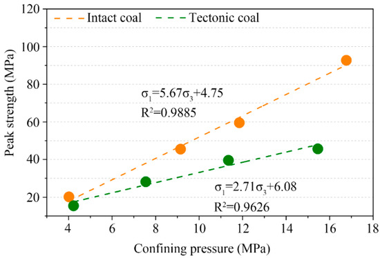 The internal friction angle and cohesion obtained by the above–mentioned method are presented in Table 3. The results indicate that the internal friction angle and cohesion of tectonic coal are lower than those of the intact coal. In particular, the cohesion (1.83 MPa) of tectonic coal is just 43.47% of that of intact coal (4.21 MPa). Under the current mining depth (500–600 m) in China, the coal strength is mainly controlled by cohesion [8]. Therefore, tectonic coal has low strength compared to intact coal. The low strength and weak cohesive property of tectonic coal are also closely related to its structure. In the tectonic coal, cohesion mainly occurs by the mechanical biting force between coal particles due to its particle aggregation property. In contrast, the intact coal basically retains its primary structure, so the cohesion is provided by the chemical bonding force between coal molecules. Compared to the chemical bonding force, the mechanical biting force is rather weak. Therefore, tectonic coal has a low strength and weak cohesive property.