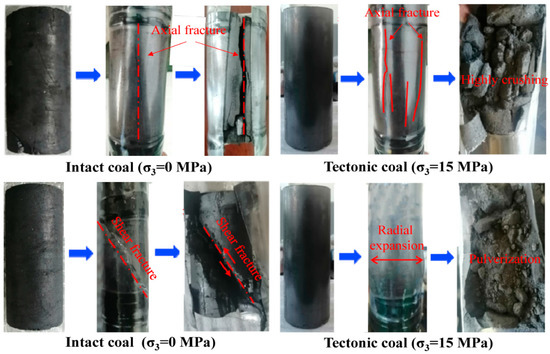 In order to achieve efficient gas extraction in the tectonic coal reservoir and thus reduce the greenhouse gas emissions, mechanical–based permeability–improving technologies, such as protective layer mining [2], hydraulic flushing [3], and hydraulic slotting [4], have been widely adopted in China. The basic principle of these technologies involves the achievement of stress unloading and plastic failure in the tectonic coal. After stress unloading and plastic failure in the coal, primary fractures get opened and many secondary fractures can be generated, which results in a significant improvement of the coal permeability. As a result, it is extremely necessary to fully understand the mechanical properties of tectonic coal in order to realize the efficient application of mechanical–based permeability–improving technologies in tectonic coal reservoirs. Recently, reconstituted coal specimens have been widely adopted to investigate the mechanical properties of tectonic coal, and some meaningful conclusions have been obtained [1]. For instance, Skoczylas et al. [5], Li et al. [6], Dong et al. [7], and Liu et al. [8] systematically measured the deformation behavior of tectonic coal. Their research results indicated that the elastic modulus of tectonic coal increased with confining pressure and loading speed, and its uniaxial compressive strength and elastic modulus were about one order of magnitude lower than those of the intact coal. Zhao et al. [9], Liu et al. [10], and Lu et al. [11] also evaluated the effect of gas on the mechanical properties of tectonic coal, and they reported that free gas has a greater weakening effect on the mechanical strength of coal than adsorbed gas. Lin et al. [12] and Tu et al. [13] tested the post–peak dilatancy of tectonic coal and found that the specimen expanded steadily due to the breaking of the bonds of coal particles in the post–peak stage. Gao et al. [14] investigated the energy evolution law of tectonic coal subjected to cyclic loads. They found that the elastic energy density of tectonic coal increased linearly with deviatoric stress and was proportional to the confining pressure and loading rate. However, the dissipated energy density increased exponentially with deviatoric stress and was inversely proportional to the confining pressure and loading rate.