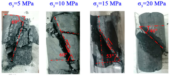 In Section 3.3.1, the post–peak failure modes of intact coal and tectonic coal under the triaxial compression stress were illustrated, and their analysis is presented by considering the confining pressure of 15 MPa as an example. Under different confining pressure values, the failure angle of tectonic coal barely changes. However, the failure angle of intact coal changes with the confining pressure. Figure 13 shows that the failure angle of intact coal decreases with the increase in confining pressure. When the confining pressure increases from 5 to 20 MPa, the failure angle decreases from 69° to 46°. The experimental results are in good agreement with the results on rock materials reported by Ma et al. [23] and Zhou et al. [24].