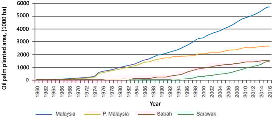 The palm oil industry has existed in Malaysia since the early British colonial era; oil palms were originally a decorative plant, but they soon grew to be a major export of the country [1]. Malaysia is currently ranked as the second largest global producer of palm oil products, and Indonesia is the leading producer. In the post-independence decade (1960s), palm oil plantations took up around 55,000 hectares (ha) of agriculture land, and the area expanded to 5.74 million ha in 2016, as shown in Figure 1. In year 2021, the plantation area has further expended to more than 5.9 million ha [2]. This shows that the palm oil industry has seen steady growth in the last decades to meet the increasing global vegetable oil demands. Palm oil products have variety use in both non-edible and edible sectors. In the non-edible sector, palm oil is used for products such as soaps, cosmetics, and biofuels. As for edible, the most common are margarine, cooking oil, and other foods [3]. The drastic increment in palm oil products demand has imposed stress on the development of the industry towards more effective and sustainable production. Due to the recent international pressure on the sustainable production of palm oil products, there are a number of initiatives being launched in Malaysia in the past decade, for example, a no burning policy, evacuation from peat soil, etc. In addition, the Malaysian government also launched a mandatory scheme of Malaysia Sustainable Palm Oil (MSPO) certification to ensure all stakeholders are fulfilling their role and responsibility in the responsible production of palm oil products. With such an initiative, the plantation which is planted in the high risk area has been evacuated. Therefore, the overall planted area decreased to 5.67 million ha in 2022 [4].