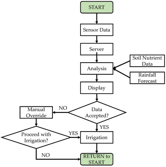 The utilisation of a smart system aims to reduce issues caused manual irrigation and fertilisation. This is achieved by using a network of sensors, controllers, and servers to determine the required amount of irrigation and fertilisation. The system works by analysing the moisture content in the soil and relaying the information to the server. Section 3 discusses the details of the smart irrigation system setup. The data are compared with forecast data and soil nutrient content data (for fertiliser application) to determine the best course of action, and the output is logged. Typically, the system consists of a digital display on a control board which allows users to see the required irrigation. If it requires fertiliser application, the system will mix the required amount of liquid N, P, and K fertiliser with the irrigation water to be distributed. A variable-rate application of NPK fertiliser on mature oil palm trees was established and designed to achieve the optimum nutrient level [24]. The flowchart below is a simplification of the smart process (see Figure 3).