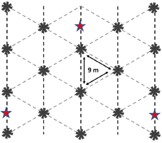 Illustration of sensor nodes’ (represented by the “red star”) positioning in oil palm plantation.