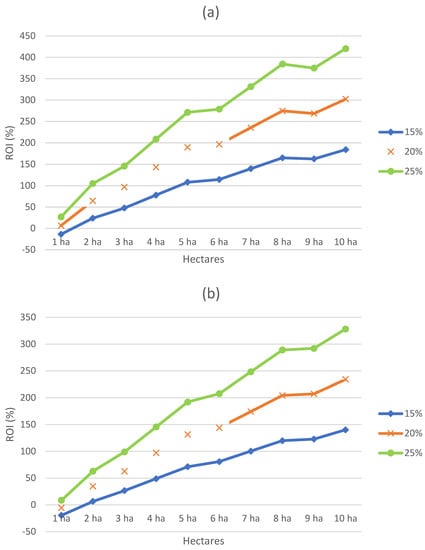 The implementation of smart irrigation systems is relatively new in the oil palm industry. Hence, the detailed evaluation of the economic performance of the technology is crucial prior to the adaptation. The evaluation was conducted based on the proposed Equations (1)–(3) and the tabulated information from Table 4 and Table 5. Due to the production from an oil palm plantation being highly dependent on the plantation land size, this study evaluated the economy performance with respect to ranging from 1 ha to 10 ha. The additional cost for server upgrade, , was estimated to be USD 1355.93. Previous studies show that the application of smart irrigation on various crops could result in an increase in production yield of between 15 and 25% [18,28]. Hence, sensitivity analyses based on the assumption of 15%, 20%, and 25% of yield improvement, , of CPO were considered in this study. The prices of CPO were taken to be 919 USD/t, and the baseline of CPO production was set to be at 5 t/ha/year [29]. Figure 5 shows the calculated ROI for smart irrigation systems for various sizes of oil palm plantations with different server options.