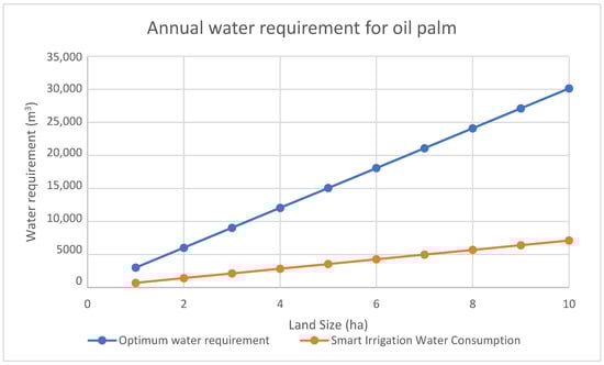 Annual water requirement for smart irrigation system for various plantation sizes.