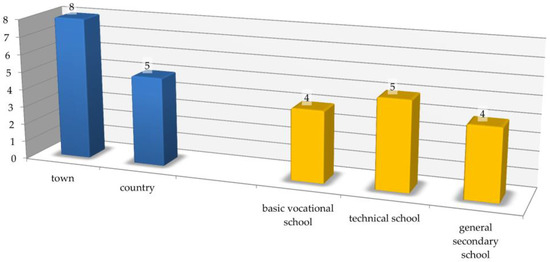 In order to verify the formulated hypothesis, the author decided to collect secondary data acquired on the basis of literature analysis including mainly governing and archival law acts from the years 2012–2018, as well as primary data on the basis of a diagnostic survey method with a questionnaire survey technique. The main stage of this action included surveying a group of 1012 students from 13 high schools (In the course of research conducted in the period from 2010 to 2018, before the educational reform launched in 2017, high schools were formally called upper secondary schools) located in two voivodships: wielkopolskie and łódzkie. The limitation to two voivodships aimed at determining a particular area of research sample selection, and choosing these two indicated voivodships was connected with technical reasons enabling performance of research with the limited resources available. Schools, and then individual classes, were randomly selected. The analysis of the researched schools allowed for stating that there are different kinds of schools (four basic vocational schools, five technical schools, and four general secondary schools) located in different environments (eight from the towns and five from the country) (Figure 1).