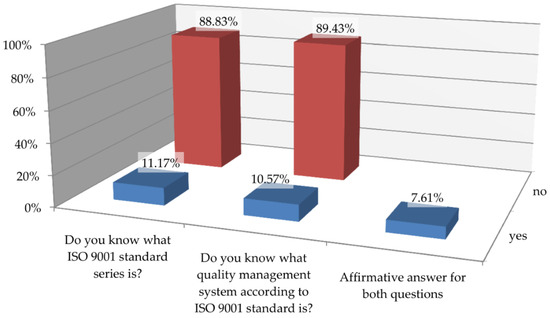 Similarly, a clear relationship between the pro-quality attitude and sustainability can be noted. This relationship can already be seen in the ISO 9000 standard itself, encouraging the implementation of other management systems as well (including the environmental management system based on ISO 14001 [33]) and emphasizing that for an organization to achieve sustained success, it is required to strike a balance between economic and financial interests and those of the social and ecological environment [34]. This connection can also be seen in the effects of the implementation of the quality management system according to ISO 9001. As pointed out by García-Quevedo, Kesidou, and Martínez-Ros, the existence of prior capabilities in the implementation of the ISO 9001 standard makes adopting the environmental ISO 14001 standard easier [35]. Even more important are the practical effects of being guided by quality in work and life, such as by making conscious consumer choices, producing less waste or optimizing processes, and the related reduction of logistics chains. As indicated by D. Zimon, P. Madzik, and R. Sroufe, ISO 9001 focuses on improving internal processes and on cooperation between the links that form supply chains, but it also has direct impacts on improving environmental processes [36].