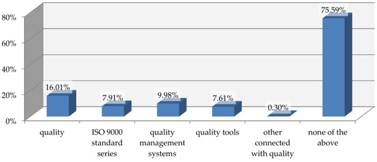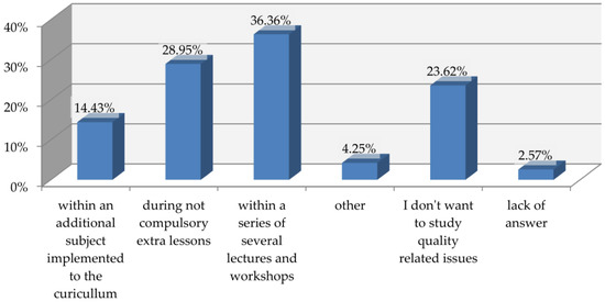 The core curriculums for particular school subjects realized in the course of education are established by a Minister of Education. Core curriculums determine educational objectives formulated as general requirements and teaching content formulated as specific requirements. The analysis of both kinds of requirements in the old and new core curriculums for the subject called the basics of entrepreneurship that is taught in high schools (in the author’s opinion, the key subject for teaching about the concept of quality), which was performed by the author, has proved that students have no obligation to get familiar with issues directly connected with quality, such as TQM, quality tools, quality as an element of competitiveness, etc. [62,63,64]. Meanwhile, students perceive this subject as the one which will teach them skills necessary in their future life, and above all, in their professional career, and it seems to be almost extraordinary in the scope of its possibility for shaping students’ attitudes [65,66].