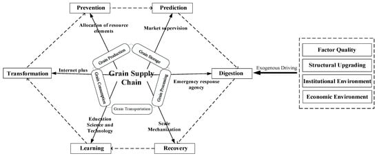 By deconstructing the grain supply chain into subfunctional links of grain production, storage, processing, transportation and consumption, the system resilience evaluation system is formed by combining prevention, prediction, digestion, recovery, learning and transformation. The strategy of strengthening system resilience is analyzed from the perspective of exogenous driving factors such as factor quality, structural upgrading, institutional environment and economic environment. The research framework is shown in Figure 1.