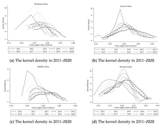 According to the measurement of grain supply chain resilience, it is more effective to take the northeast, eastern, middle and western China as spatial analysis units [], which is conducive to fully interpreting spatial differences. The distributions of the nuclear density curves in each region from 2011 to 2020 are shown in Figure 3.