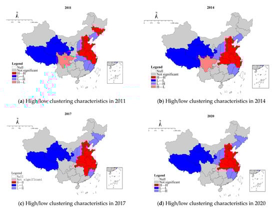 With the help of local Moran’s I, the representative years are selected to interpret the local spatial similarities or differences in the development of China’s grain supply chain resilience, as shown in Figure 4.