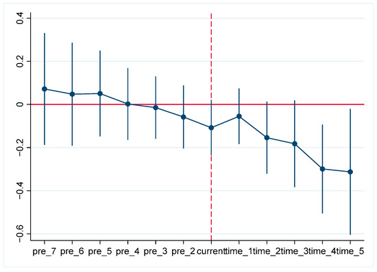 To utilize the DID model, it is necessary to meet the parallel trend assumption, which requires the treatment and control groups to share a similar trend prior to intervention. Failure to meet this requirement can lead to biased estimates and potential overestimation. In practical investigations, the temporal trend graph method and the event study method are commonly used to assess the parallel trend assumption. Among them, the event analysis method is considered more reliable and scientifically rigorous. To evaluate whether the sample satisfied the parallel trend assumption, this paper utilized the event study method.