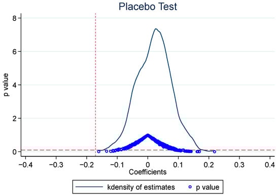 It can be seen from Figure 2 that most of the estimated coefficients are on the right side of the vertical red dotted line, and most of the data points are distributed above the horizontal red dotted line with p = 0.1, which indicates that the policy significance result and effect intensity are greatly reduced after the double random treatment, proving the robustness of the aforementioned benchmark regression results.