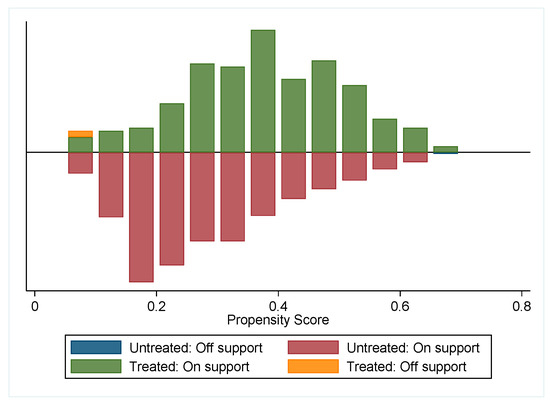 The model’s validity before applying the PSM-DID must be evaluated. Here, determining whether the variables in the experimental group and control group become balanced after matching was given priority. The findings in Table 5 and Figure 3 confirm the validity of the use of PSM-DID in this study by demonstrating that the model supports the common hypothesis test and that only the outcome variable LNEMI is significant, while other variables, such as POV and ENR, are not conspicuously different. Additionally, the majority of variables are “On support,” as shown in Figure 3.