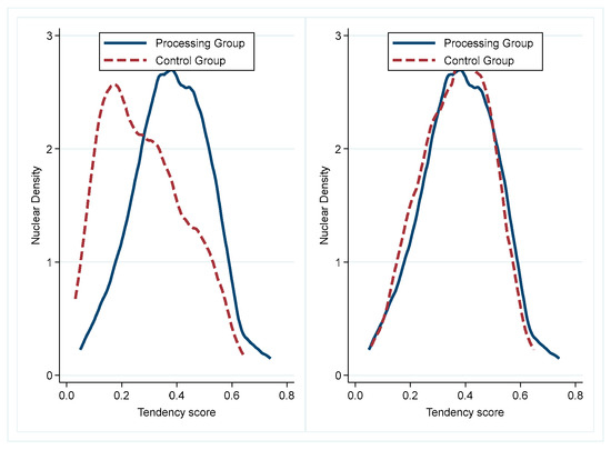 where denotes the set of covariates for the ith prefecture-level city, i.e., the control variables described earlier. is the probability that the ith city is within the policy area, and the control group was obtained after matching the many non-policy area cities selected for the study that were close to the propensity score of the cities in the strategic area.