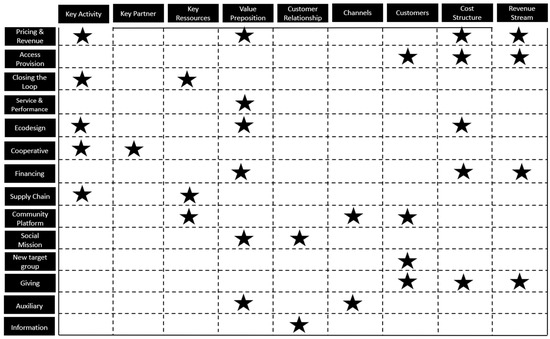 Here, black stars represent the focus of a single business model patterns; however, this does not mean that the other dimensions are not addressed, but rather that a focus is defined for the purpose of demarcation.