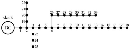 To validate the proposed two-stage optimization methodology, the monopolar DC version of the IEEE 33-bus grid was used as a test feeder. This is a radial distribution network composed of 33 nodes and 32 distribution branches, which is operated with a voltage magnitude of 12,660 V at the terminals of the substation bus. The schematic connections between the nodes of this test feeder are presented in Figure 1.