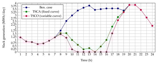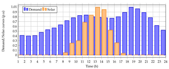 A typical curve for the metropolitan area of Medellín (Colombia) was considered, to evaluate the average daily behavior of the PV generation units. Figure 2 depicts this expected per-unit generation curve. Information regarding solar radiation, irradiance, and temperature were collected from a year’s worth of analysis in the NASA database. This information was processed, with the purpose of obtaining the average behavior for the metropolitan area of Medellín, considering the efficient use of PV modules, in order to obtain the expected generation profile reported in Figure 2. For more details regarding the characterization of these demand and solar curves, please refer to [36].