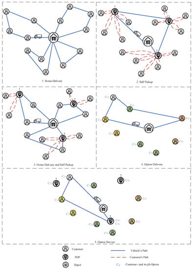 - Introduction of a novel variation in the VRP: proposing an LMDP with service options (LMDPSOs) by considering home delivery, self-pickup, and delivery options at different prices. In the LMDPSOs, we also consider pickup and delivery simultaneously.