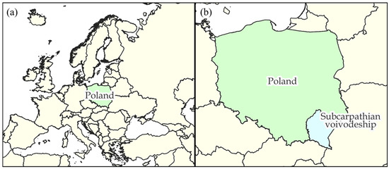 (a) Location of Poland on the map of Europe; (b) Location of the Subcarpathian voivodeship on the map of Poland. Source: own elaboration.