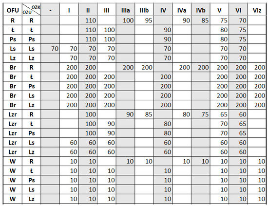 The table lists all types of land use/soil valuation classes in the appraised area. Types of land use/soil valuation classes were defined based on a unique combination of attributes: OFU—land use type (first column), OZU—soil classification contour type (second column) and OZK—soil class designation (first line). Other fields in the table denote unit values of respective land use/soil valuation classes expressed in points/ha. Empty fields mean the specific land use/soil valuation class is absent in the study area.