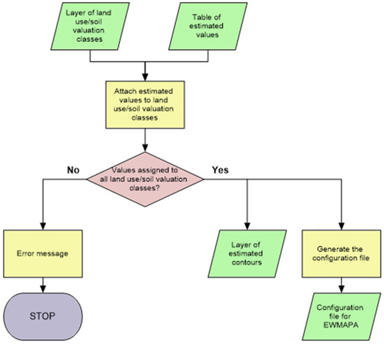 For the needs of the adopted purpose, that is, developing a tool to automate the operations of comparative land value estimation procedure, we created a dedicated algorithm to process spatial data and tabular input into geometric objects representing land use/soil valuation classes supplemented with corresponding estimates. These objects constitute necessary input to calculate the land value for respective farmsteads. Figure 2 is an overview of the general flow chart of the algorithm.