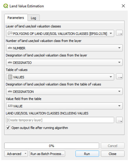 The result of the adopted assumptions, described in detail in Section 2, is a model algorithm, providing the possibility of automated calculation of estimated land values based on a vector layer of land use/soil valuation classes and a table containing their values. The target interface of the tool, supported by QGIS, is shown in Figure 5.