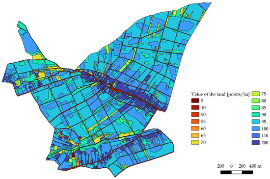 In several seconds’ a continuous and complete map of land value for the study area is ready, which can be used as the basis for calculating the land value of existing agricultural holdings and designing new ones based on the value criterion. The explicit spatial differentiation of the unit value of land corresponds with the arbitrary methods of valuation. The highest score (200 points) was recorded, particularly in the central and southern parts of the village in the built-up areas. By contrast, areas with the minimum score (5 or 10 points) are roads and other transport areas. Intermediate scores (50–110 points) in particular refer to agricultural land (arable land, meadows and pastures) with different soil quality classes.