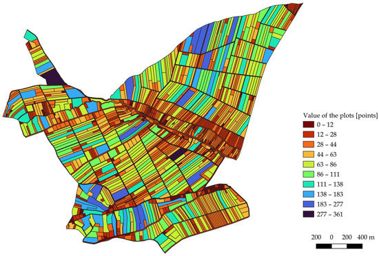 To illustrate the practical applications of the outcomes, the scores were also calculated for particular plots, taking into account their surface area and unit value of respective types of land use/soil valuation classes. Figure 7 contains a graphic representation of the calculated result.