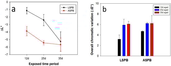 Oven ageing induced a lightening decrease of the treated surfaces, which increased with exposure time (Figure 1). In fact, the chromatic coordinate L*, that is related to surface brightness, was much more affected than a* and b*, and its value distinctly decreased with the ageing time (ΔL* < 0, Table 1, Figure 1a). The brightness lowering of organic coatings is a visible effect that is usually suggestive of their degradation due to ageing processes [26,27].