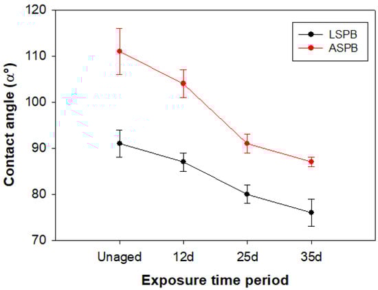 Ageing also affected the coating surface behaviour towards water for both of the examined stones. Contact angle (α) values underwent a gradual decrease with ageing time (by 16.5% and 21.6% for LSPB and ASPB, respectively), indicating that the hydrophobic character of the polymer was partially lost with its decay (Figure 2 and Table S1). This effect was particularly pronounced in the case of the treated Arenaria stone whose α value dropped from about 111° (distinct hydrophobic character) to about 87°.