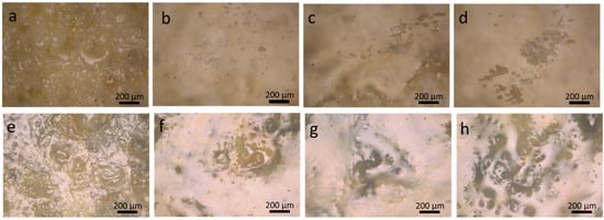 Optical microscope images of both of the coated stones, taken before and after different ageing cycles: (a) unaged LSPB; (b) 12 d LSPB; (c) 25 d LSPB; (d) 35 d LSPB; (e) unaged ASPB; (f) 12 d ASPB; (g) 25 d ASPB; and (h) 35 d ASPB.