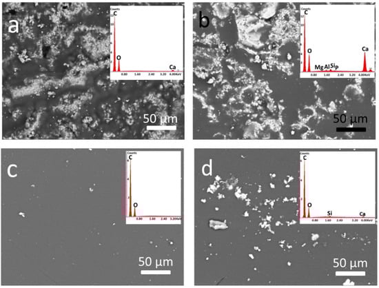 On the contrary, the polymer distribution on the surface of the Lecce stone significantly changed after the prolonged oven exposure. At the end of the ageing process, the details of the stone morphology are more visible than before. Some peaks appear in the EDS spectrum of the aged sample, which corresponds to elements (Mg, Al, Si, P) typical of the stone’s composition. Moreover, the peaks of Ca, which had a very low intensity in unaged LSPB (about 2–3% w/w), distinctly increased its intensity (up to 17–18%) after ageing (see inset in Figure 4a,b).