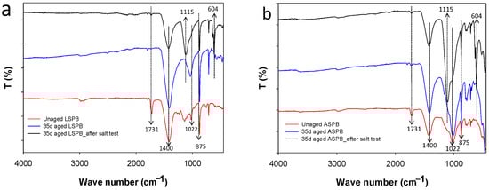 FTIR spectra (ATR mode) of unaged and aged coated samples after oven-artificial-ageing cycles and after the salt crystallization test: (a) LSPB and (b) ASPB.