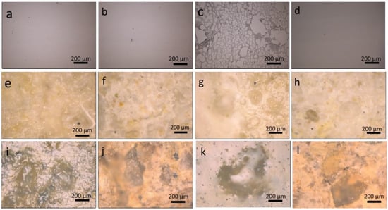 The images of the coating surface taken by an optical microscope on LS and AS before and after artificial ageing are reported in Figure 3. The prolonged exposure to the artificial ageing conditions (T = 70 ± 2 °C, RH = 15 ± 2%) clearly affected the physical appearance and the morphology (texture) of the Paraloid B-72 coating. The polymer layer on the stone surface appeared quite damaged (matt looks with removal in some areas too), and sometimes its adhesion to the substrate was partially lost. The damaging effects were more and more evident as the ageing time increased (Figure 3a–d and Figure 3e–h for LS, and AS, respectively). Similar results were observed also in artificially weathered coating films obtained from polymer deposition on the glass slides.