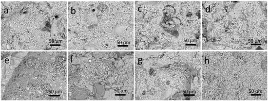 SEM images of stones after cleaning by the NSE-cellulose pulp method (2 poultice applications): (a–d) LS; and (e–h) AS from unaged to 12 day-aged, 25 day-aged, and 35 day-aged, respectively.