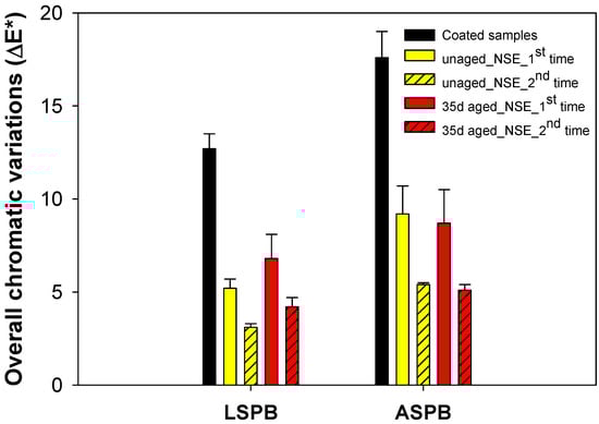 The overall chromatic variations observed for both types of coated stones before (black bars) and after exposure to the NSE-loaded cellulose pulp cleaning method (coloured bars; difference vs. plain uncoated stones).