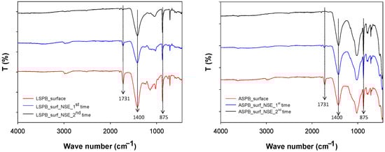 In addition, -FTIR analyses were conducted directly on the treated surfaces of the LSPB as well as the ASPB specimens before and after cleaning with the NSE-cellulose pulp poultice, and the results are in good agreement with those obtained by the experiments (SEM and chromatic variations) described above. Spectra obtained for LSPB and ASPB are reported in Figure 9. The characteristic peaks of polyacrylate (C=O stretching at 1731 cm−1 and C-O stretching at 1000–1200 cm−1) [2,32,33] progressively disappear after the first and the second cleaning steps. At the same time, the relative intensity of the bands due to the main stone components (1400 and 875 cm−1 due to carbonate in both LS and AS, and about 1100 cm−1 corresponding to silicate in AS [14,29]) increase over the cleaning process.