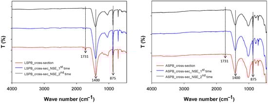 FTIR spectra (ATR mode) on powder samples taken from cross-sections of the LSPB (left) and ASPB specimens (right) before and after cleaning steps by the NSE-cellulose pulp (all the spectra were average from many collected data).
