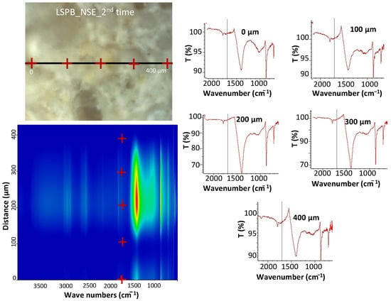 Micro-FTIR maps were collected in different areas of the cleaned surfaces. As an example, the average map and the corresponding spectra taken on the LS surface is illustrated in Figure 11 (an analogous example for AS is reported in Figure S3). Surfaces of cleaned specimens were examined along a distance of 0.5 mm and spectra were taken every 100 μm. The spectra registered by using the ATR technique in different points of the same area can be quite different due both to the surface roughness as well as to the compositional differences at a microscopic level. For instance, in the case of AS (Figure S3), some spectra do not show any intense band (poor contact of ATR crystal with the surface) or display mainly peaks related to carbonate or silicate components. At any rate, no peak due to absorption of the polymer or other organic material can be detected in all the examined areas.