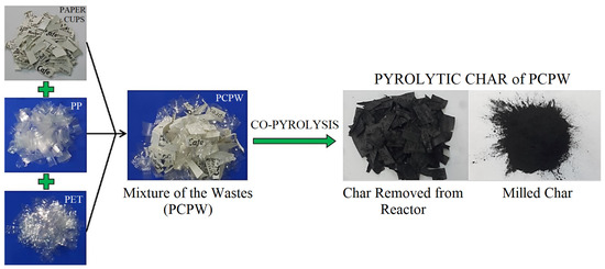 Paper cups, PP waste, PET waste, the mixture of the wastes (PCPW), and char.