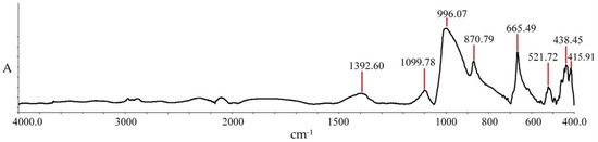 From the FTIR analysis results of PCPW char, the highest peak at 996.07 cm−1 and the other relatively high peaks at 665.49 cm−1 and 870.79 cm−1 are observed (Figure 3). Additionally, it is also observed that the intensity of peaks that occurred is mainly between around 1400–400 cm−1. In this study, FTIR analysis results showed that almost no vibrations between 3200 cm−1 and 3600 cm−1. This may be attributed hardly no O–H groups in the char structure [19,26,38]. The peak at 870.79 may be attributed to the aromatic C–H group vibrations [38,39]. The relatively weak peak of 1392.60 cm−1 may be ascribed to C–H groups [26,39]. Additionally, the peaks between 950 and 1300 cm−1 may be attributed to C–O vibrations [19,39]. This result may be obtained due to the impact of the presence of PET and PP as different plastic waste materials in the mixture.