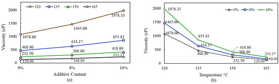 (a) Change in viscosity of binders with additive; (b) change in viscosity of binders with temperature.