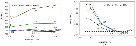 (a) Change in G*/sin δ of binders with additive; (b) change in G*/sin δ of binders with temperature.