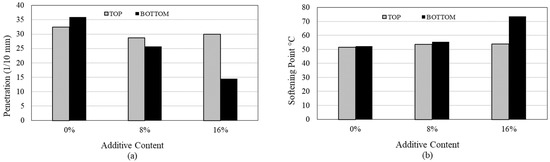 To determine the storage stability of the binders, softening point tests and penetration tests are applied on the bottom and top parts of the binders in aluminum tubes. The difference in penetration values between the bottom and top parts of the binders must not exceed 9 mm−1, and the difference in softening point values must not exceed 5 °C [40].