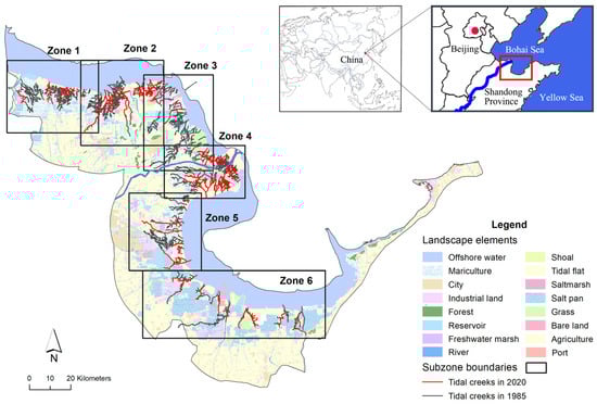 As each tidal creek was constructed as a hydrological network to analyze, the range of landscapes that could cover each of them is satisfied. To reduce the amount of computation, we divided the study area into six zones according to hydrological conditions, administrative divisions, and characteristics of the reclamation activities (Figure 1). Zone 1 mainly contained the Taoer River estuary, which formed part of the course of the Yellow River in 1855. Zhanhua County is the major administrative area in this zone. Zone 2 contained the Diaokou River estuary, which formed part of the course of the Yellow River in 1976. Hekou District is its major administrative area. Zone 3 contained the Shenxian Stream estuary, which formed part of the course of the Yellow River in 1953–1976. Hekou District is the major administrative area in this zone and the Shengli Oilfield located in it. Zone 4 contained the current course, the Qingshui Stream and Qingbacha course, of the Yellow River into the sea. The National Reserve of the YRD is located in this area. Zone 5 contained the abandoned southern subdelta. Dongying District is the major administrative area and is dominated by agriculture and urban construction. Zone 6 contained Laizhou Bay. Weifang City was the major administrative area of this zone, and salt mining is the historically important industry here.
