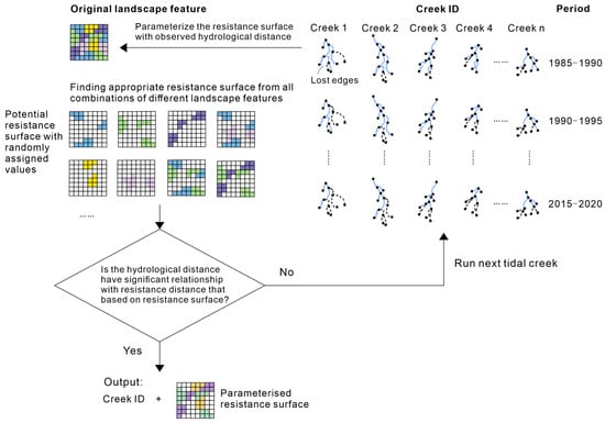 The flowchart of assessing landscape resistance surface and identification of key tidal creeks. Different colors represent different land features.